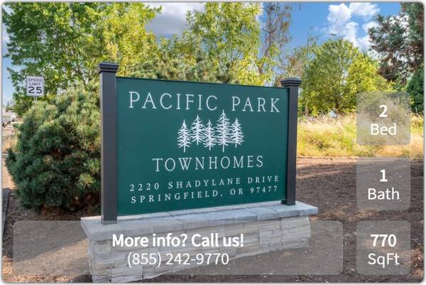 Pacific Park is located in Springfield, OR off Hayden Bridge Road, close to the Pioneer Parkway shopping center and the EMX bus line. Each townhome is a two-bedroom with one or one and a half bath, a large garage, and laundry hookups.