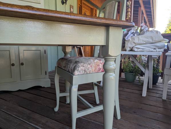 Solid wood table and chairs, have been completely refinished. The set has a sage green paint, chair inset has an off white paint. Multiple coats of polyurethane finish. The table top has a rich stained finish. These also have multiple coats of polyurethane. The chairs have a memory foam seats cushion with new upholstery. This is a beautiful set and would look great with any decor. Priced to sell now!