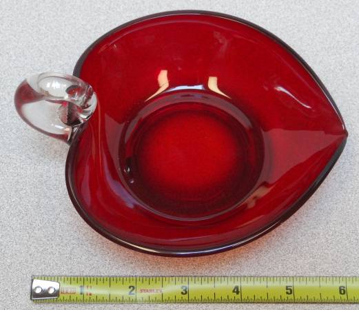 This beautiful little red-glass, heart-shaped candy or trinket dish is a great addition to any collection, or just to sit on the coffee table and collect candy. There are no scratches, chips, cracks or any other damage.