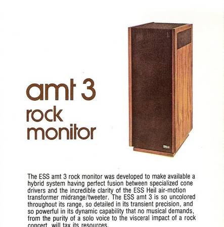 As a result, one of the most treasured ESS models... the 1974 ESS AMT 3 Rock Monitors were designed, adding an isolated 6" mid-range driver to compliment the two 10" woofers