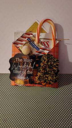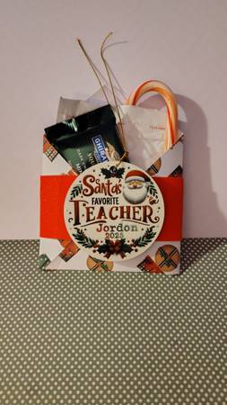 These super cute 3 inch round ornament packs come with hot chocolate and candy. They make great neighbor and teacher gifts.