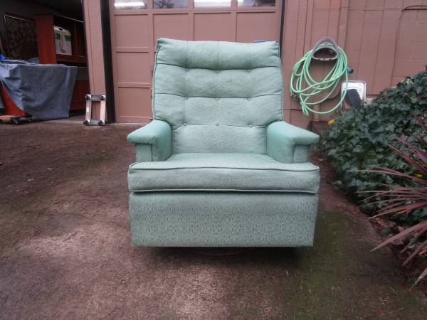 Nice lines and fabric. Great floating design. Very comfortable with tilt back and swivel. Some light discoloration on one side that will probably wash out. :mcm mid-century recliner modern vintage: