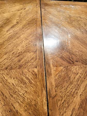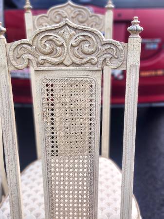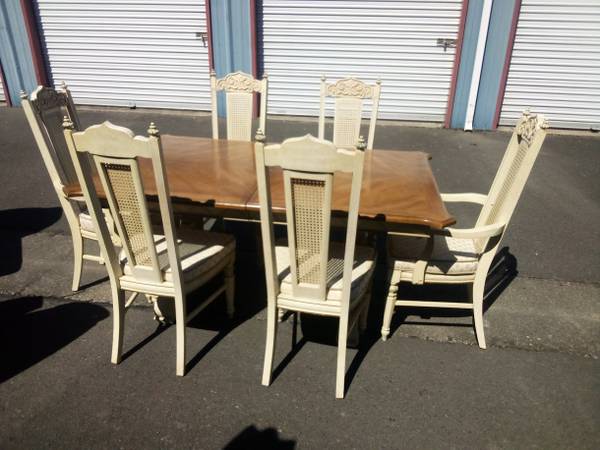Beautiful vintage solid wood table with (4) white painted solid wood chairs. Nice condition. Cushions look good with minimal use. 30" h x 41.5" w x 65.5" long