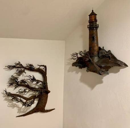 Ken Scott Original metal sculpture- Custom design, commissioned art work, OREGON LIGHTHOUSE -Yaquina Head Lighthouse and Coastal pine. Two exquisite metal sculptures