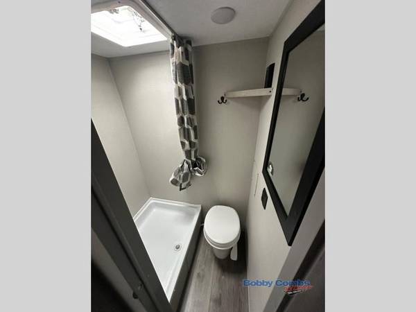 This travel trailers is perfect for a young family or smaller group. You can easily sleep four or more with the rear set of bunk beds and queen bed up front. There is also a 60" sofa for inside down-time, as well as complete kitchen and bath amenities so you can cook and stay clean while traveling. The rear corner bath features a toilet and 36" x 30" shower, and it's conveniently located next to the bunk beds which is great for little ones at night. Cooking inside will be easy with a GE stainless two-burner cooktop and single sink, plus there is also a GE microwave oven for snacks and things that you can easily warm up. If you plan to spend most of your time outdoors, you will find plenty of storage space in the front exterior storage compartment, and there is also plenty of storage inside as well.