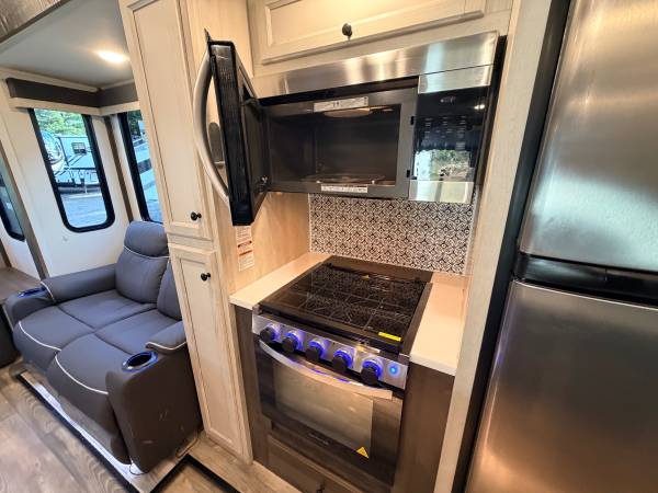 2022 Cardinal by Forest River Limited Series 377MBLE 5th wheel - 42.5' long - 4 slide out's - Front king bedroom, large closet that has washer / dryer prep - Bathroom w/ stand up shower- The kitchen has a 4 door electric/propane refrigerator, table w/ 4 chairs, pantry space, microwave, 3 burner propane stove and island w/ sink - The living room has two couches, 50" smart TV, electric fireplace - off the kitchen is the 2nd bedroom or office w/ bunk beds - Large separate loft bed above - This unit also has self leveling jack system, Extended seasons package w/ tank heaters - two A/C units, two power awnings, large pass though under body storage - Clean title - More pics on my website: thervbarnnw . com