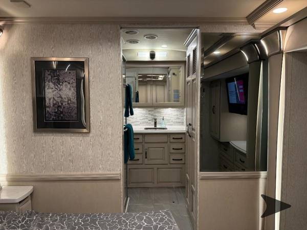 Inside, enjoy a spacious, well-appointed interior with three slides, comfortable seating, and room for up to 6. The floorplan includes luxury living areas, a euro-booth dinette, ample storage, and premium entertainment systems, perfect for families or full-time travelers.